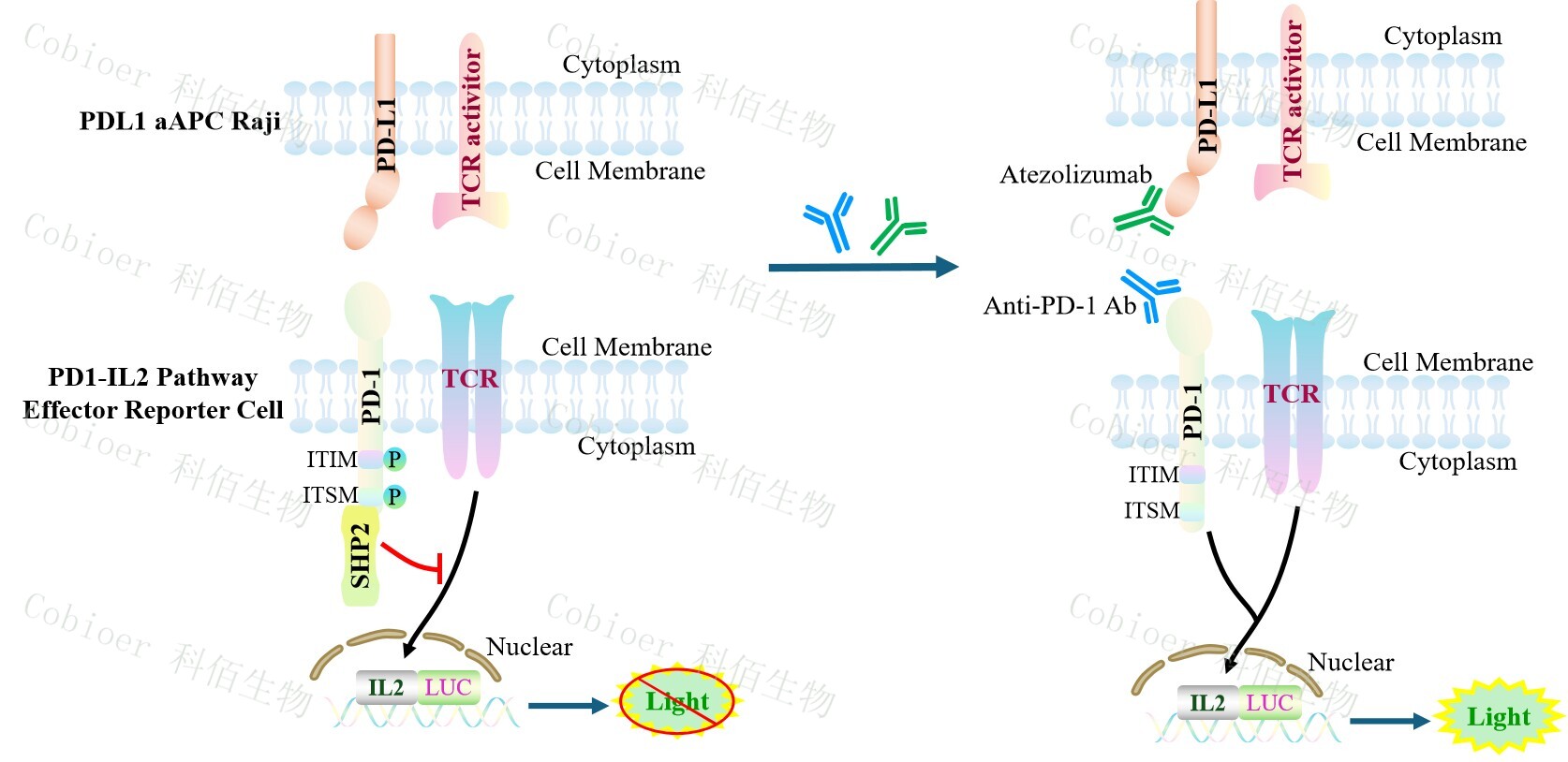 PDL1 aAPC Raji 作為 PD1-IL2 Pathway Effector Reporter Cell 的靶細(xì)胞,藥靶模型很好 的模擬了體內(nèi) PD1&PDL1 的信號(hào)轉(zhuǎn)導(dǎo)過(guò)程,原理見(jiàn)下圖所示。![]() Figure 1. PDL1 aAPC Raji 模型原理圖
