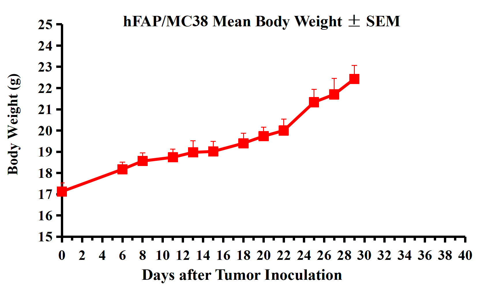 Figure 2. hFAP/MC38 Mean Body Weight ± SEM.