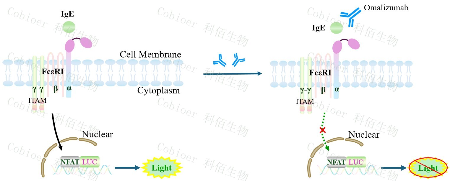 FcεRI Effector Reporter Cell 藥靶模型很好的模擬了 FcεRI的信號(hào)轉(zhuǎn)導(dǎo)過程,原理見下圖所示。