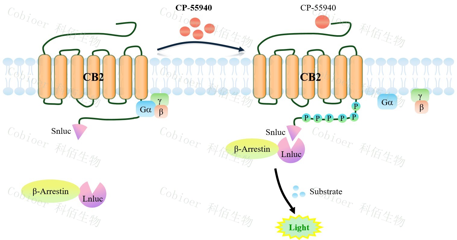 CB2 β-Arrestin CHO 報告基因藥靶模型很好的模擬了體內(nèi) CB2/β-Arrestin 的信號轉(zhuǎn)導(dǎo)過程,原理見下圖所示。當(dāng)缺乏配體刺激時,β-Arrestin 不與 CB2 結(jié)合,融合β-Arrestin 的熒 光素酶處于失活構(gòu)象,當(dāng) CB2 遭遇配體刺激時,融合熒光素酶報告基因的β-Arrestin 被招 募,使熒光素酶報告基因處于激活狀態(tài),加入其底物后發(fā)光信號增強。![]() Figure 1. CB2 β-Arrestin CHO 細(xì)胞模型原理圖 |