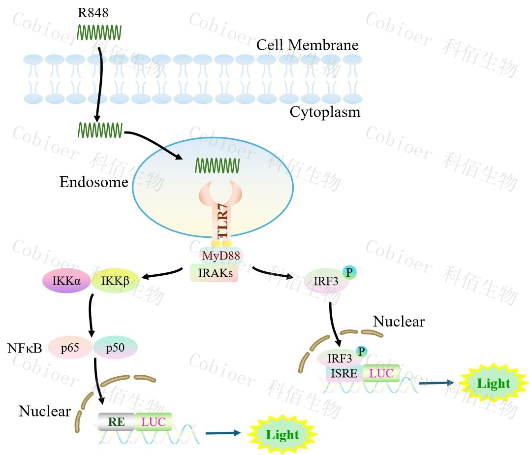 TLR7 NFκB&ISRE Dual Reporter Cell 報告基因藥靶模型很好的模擬了體內(nèi) TLR7 的信號轉(zhuǎn)導(dǎo)過程,原理見下圖所示。![]() Figure 1. TLR7 NFκB&ISRE Dual Reporter Cell 細胞模型原理圖 |