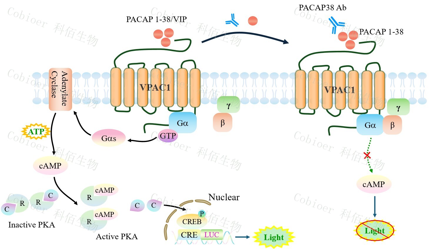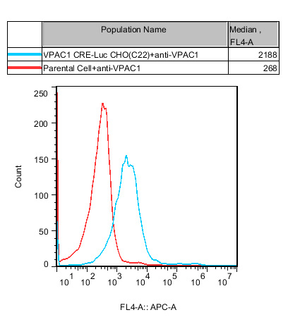 VPAC1 CRE-Luc CHO 報告基因藥靶模型很好的模擬了體內(nèi) VPAC1 的信號轉(zhuǎn)導(dǎo)過程, 原理見下圖所示。![]() Figure 1. VPAC1 CRE-Luc CHO 細胞模型原理圖 |