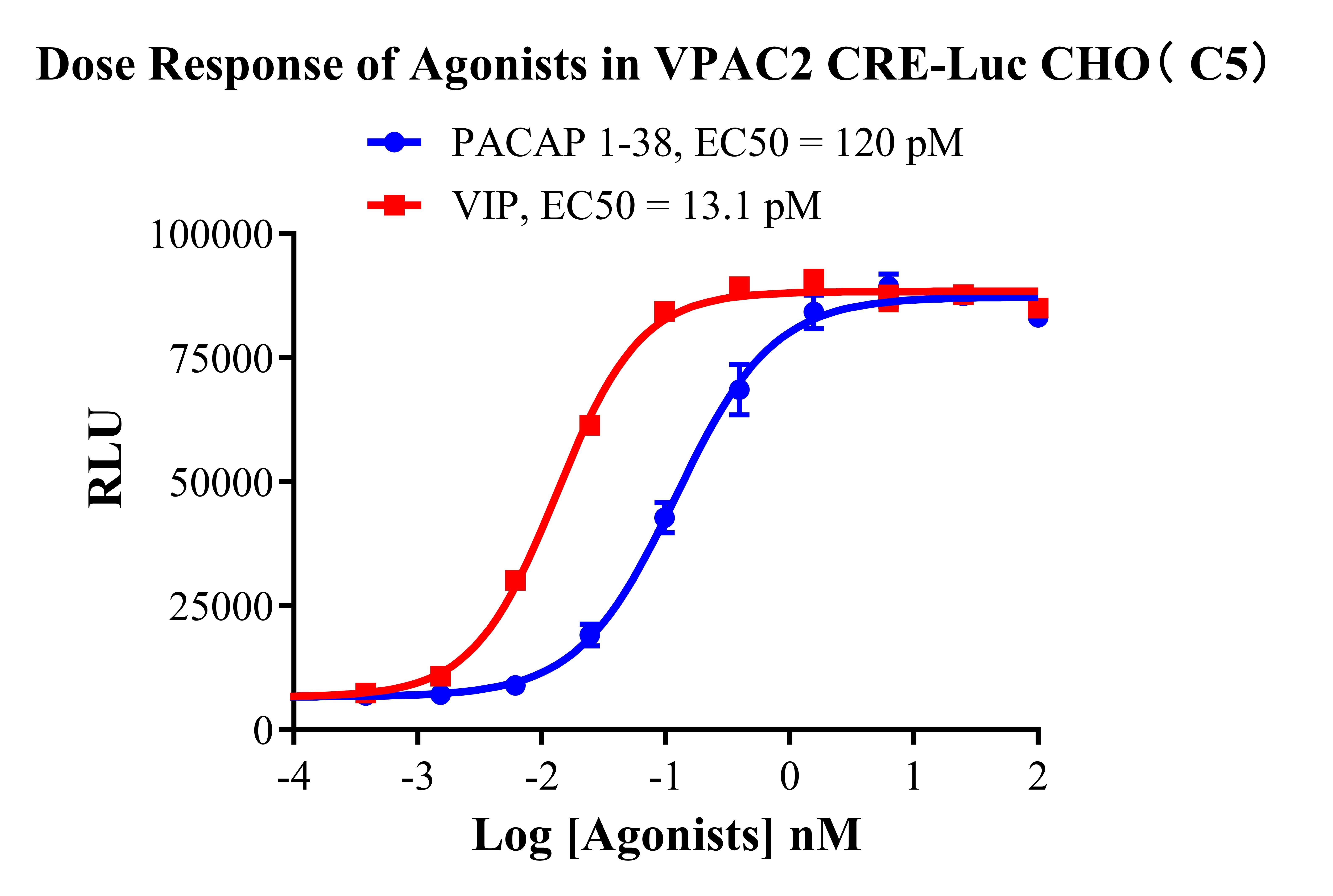 | PACAP/VIP 受體家族屬于 B 類 G 蛋白偶聯(lián)受體(GPCR),包含 PAC1R (PAC1)、 VPAC1R (VPAC1) 和 VPAC2R (VPAC2) 三個(gè)亞型,共同響應(yīng)神經(jīng)肽 PACAP(垂體腺苷酸 環(huán)化酶激活肽)和 VIP(血管活性腸肽)的調(diào)控,通過(guò)激活 Gs/cAMP-PKA 核心信號(hào)軸 (部分亞型偶聯(lián) Gq/PLC)廣泛協(xié)調(diào)神經(jīng)內(nèi)分泌、代謝穩(wěn)態(tài)與免疫調(diào)節(jié)。 VPAC2 受體(血管活性腸肽受體 2 型)作為 B 類 GPCR 的核心亞型,主要富集于下丘 腦視交叉上核(SCN)、胰腺β細(xì)胞、脂肪組織及骨細(xì)胞,以同等高親和力結(jié)合 VIP 和 PACAP,通過(guò) Gs/cAMP-PKA 通路調(diào)控代謝穩(wěn)態(tài)與晝夜節(jié)律。VPAC2 的激活可同步 SCN 生物鐘基因(如 Per2)振蕩以維持睡眠-覺醒周期、促進(jìn)胰島素/胰高血糖素脈沖式分泌調(diào) 控血糖平衡、抑制破骨細(xì)胞分化并增強(qiáng)骨形成。 | |