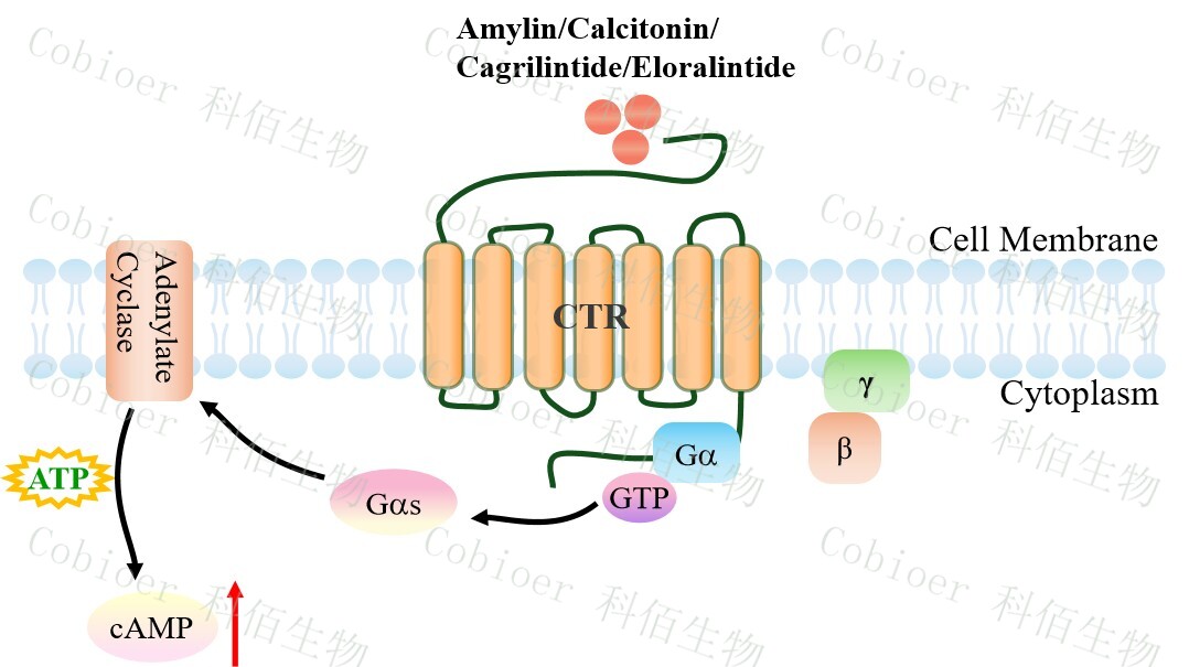 胰淀素(Amylin)受體的三種類型的已被確定,即 AMY1,AMY2 和 AMY3。胰淀素 受體屬于 B 類 GPCR,是異二聚體復合物,由降鈣素受體(CTR)與受體活性修飾蛋白 (RAMPs)結(jié)合形成。該受體的 CTR 組分具有相同的 GPCR 結(jié)構(gòu):7 個跨膜相互連接的α- 螺旋,將細胞外信號傳遞到細胞內(nèi)細胞質(zhì)信號級聯(lián)。RAMP 有三種類型(RAMP1、 RAMP2 和 RAMP3),它們共享 31%的氨基酸序列,具有相似的基本結(jié)構(gòu)。RAMP 是將 CTR 轉(zhuǎn)運到細胞膜并調(diào)節(jié)其配體特異性的重要肽,它可以改變特定 GPCR 的藥理學、功能 和細胞運輸。