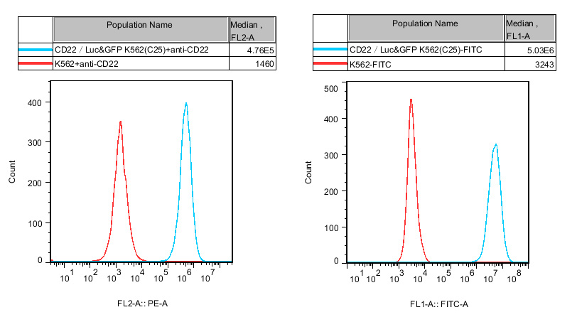 ![]() Figure 1. Recombinant CD22/Luc &GFP K562 stably expressing CD22 & GFP.