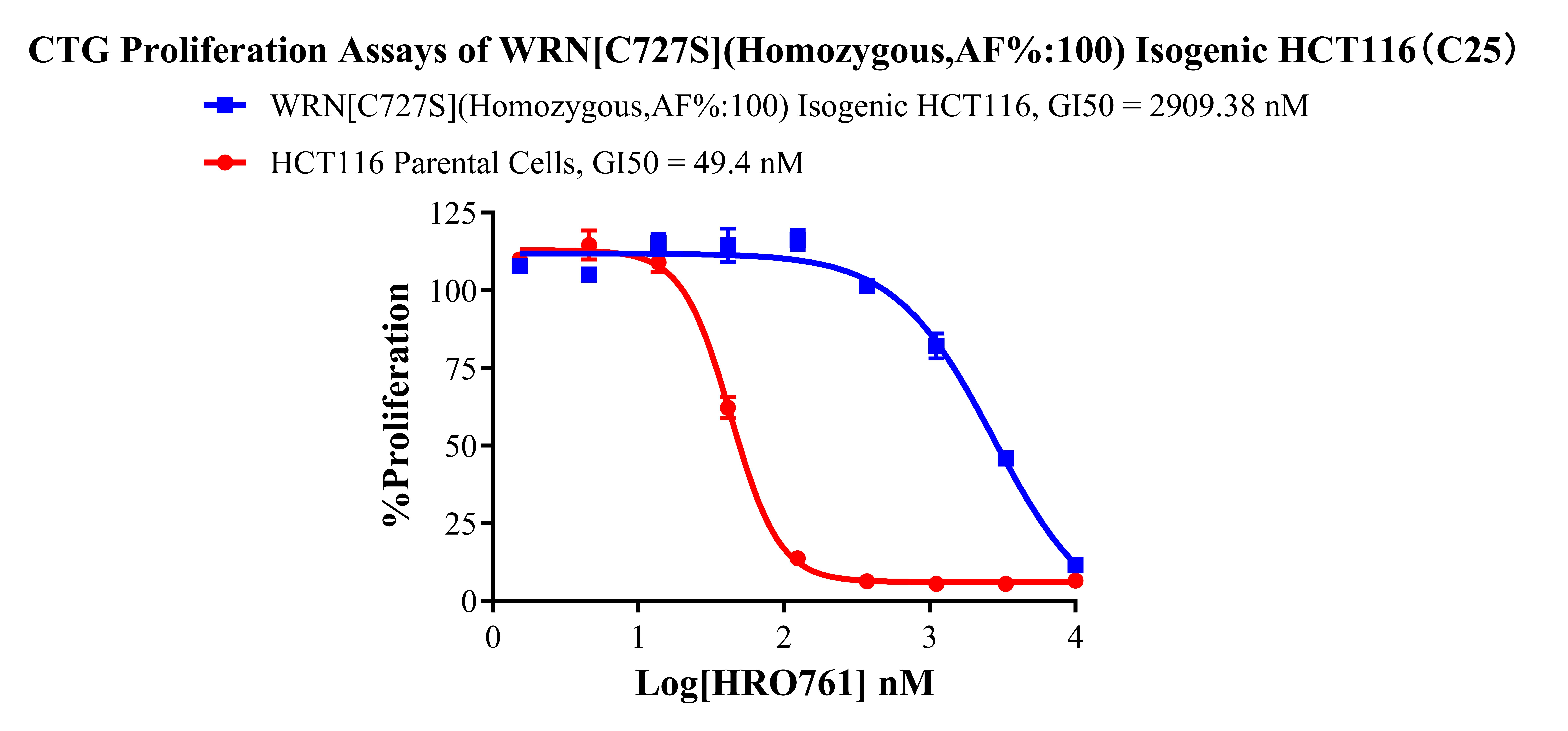 WRN[C727S](Homozygous,AF%:100) Isogenic HCT116 藥靶細(xì)胞,通過基因編輯的方式將 WRN 的 727 位氨基酸胱氨酸(C)突變?yōu)榻z氨酸(S)。![]() Figure 1. WRN[C727S](Homozygous,AF%:100) Isogenic HCT116 原理示意圖 |