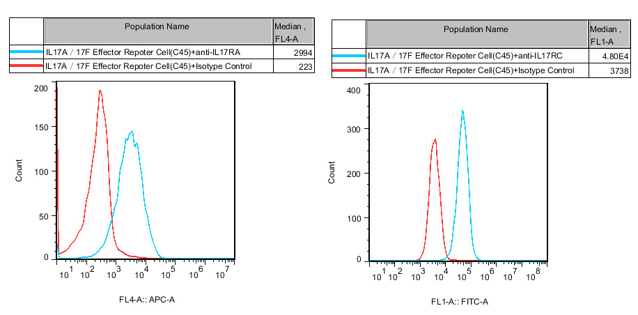 ![]() Figure 2. Recombinant IL17A/17F Effector Reporter Cell stably expressing IL17RA&IL17RC. ![]() Figure 3.Dose Response of Ligands in IL17A/17F Effector Reporter Cell (C45). ![]() Figure 4. Inhibition of Human IL17A induced Reporter Activity by IL17RA Blocking or IL17A Neutralization Ab in IL17A/17F Effector Reporter Cell(C45). ![]() Figure 4.Inhibition of Human IL17F induced Reporter Activity by IL17RA Blocking or IL17F Neutralization Ab in IL17A/17F Effector Reporter Cell (C45). |