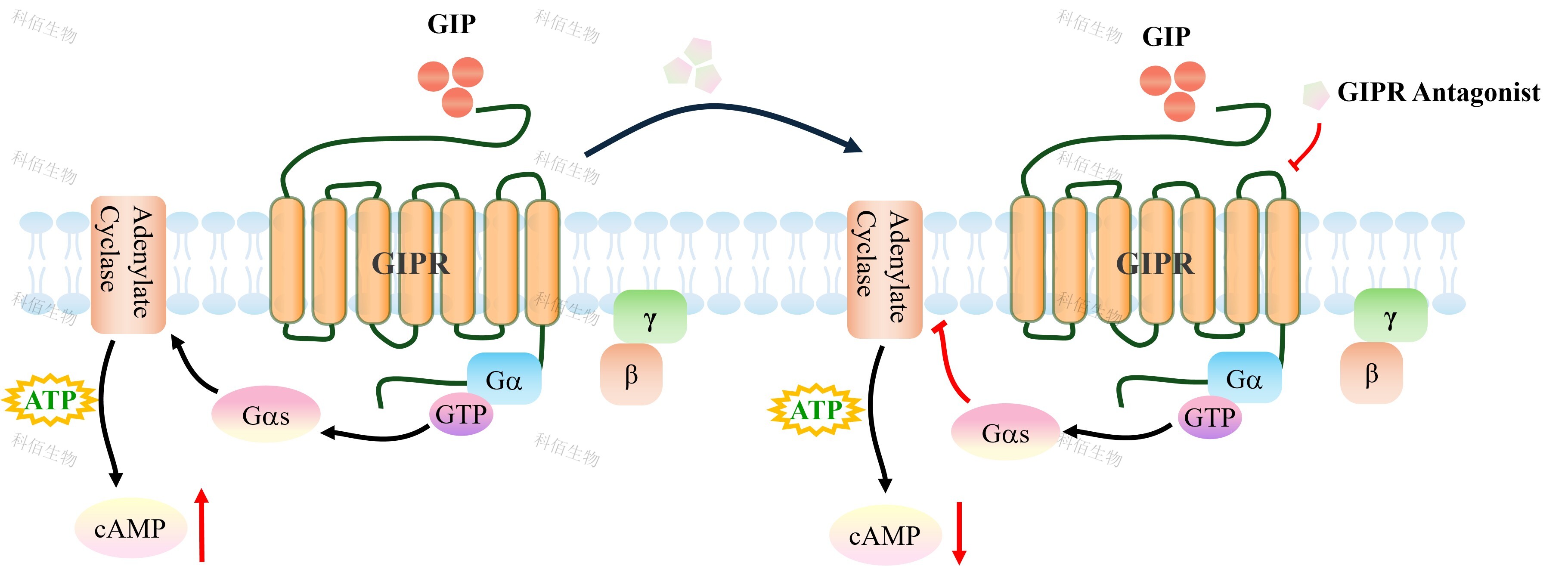 葡萄糖依賴性胰島素促泌多肽(又稱抑胃肽,GIP)、胰高血糖素樣肽-1(GLP-1)和 胰高血糖素(GCG)是負(fù)責(zé)葡萄糖穩(wěn)態(tài)的肽激素。它們的同源受體GIPR、GLP-1R和 GCGR屬于B1類GPCR家族。胃抑制多肽受體(GIPR)是GIP的受體,是一種具有7個(gè) 跨膜結(jié)構(gòu)域的G蛋白偶聯(lián)受體。它與GIP激素結(jié)合,以葡萄糖誘導(dǎo)的方式增強(qiáng)胰腺β細(xì)胞 胰島素的合成和分泌。胰腺β細(xì)胞上的GIPR在信號級聯(lián)中起著關(guān)鍵作用,導(dǎo)致血糖水平 升高時(shí)胰島素釋放。 |