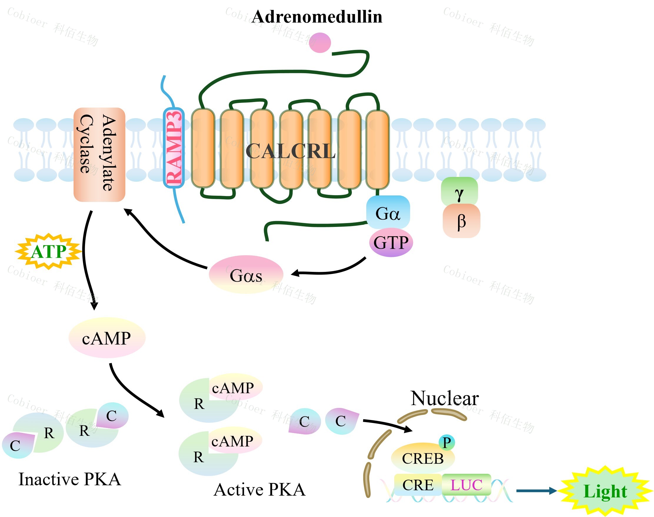 CALCRL&RAMP3 CRE-Luc HEK293 報(bào)告基因藥靶模型很好的模擬了體內(nèi) Adrenomedullin 的信號轉(zhuǎn)導(dǎo)過程,原理見下圖所示。
