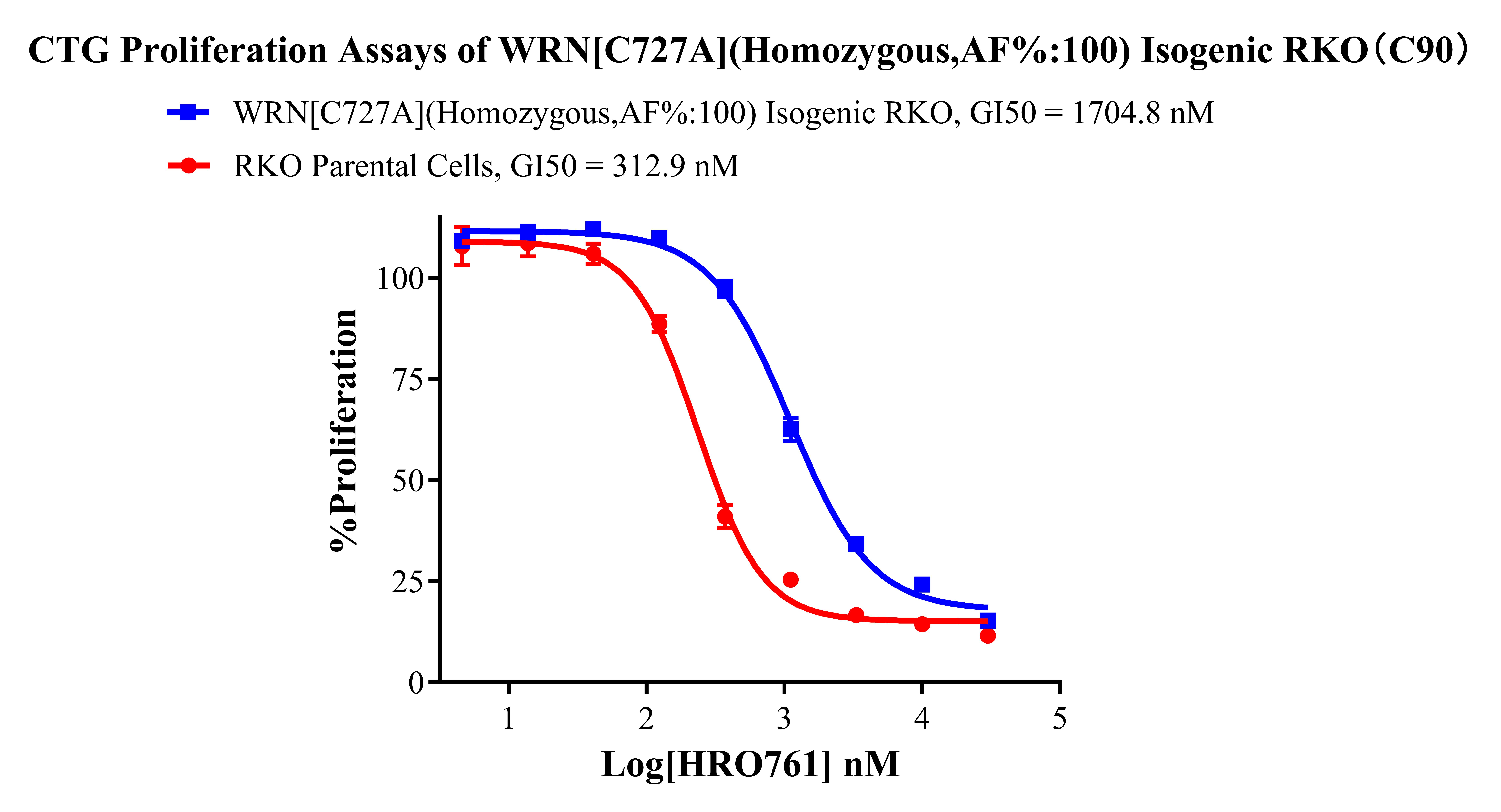WRN[C727A](Homozygous,AF%:100) Isogenic RKO 藥靶細胞,通過基因 編輯的方式將 WRN 的 727 位氨基酸胱氨酸(C)突變?yōu)楸彼幔ˋ)。![]() Figure 1. WRN[C727A](Homozygous,AF%:100) Isogenic RKO 原理示意圖 |
