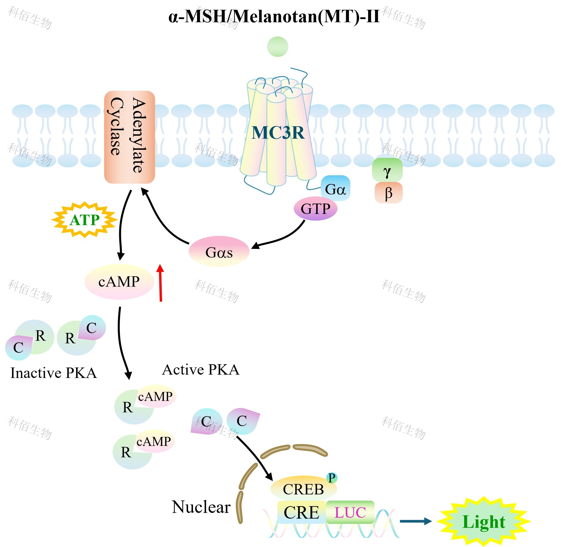 MC3R CRE-Luc CHO 細(xì)胞藥靶模型很好的模擬了體內(nèi) MC3R 的信號轉(zhuǎn)導(dǎo)過程,原理見下圖所示。