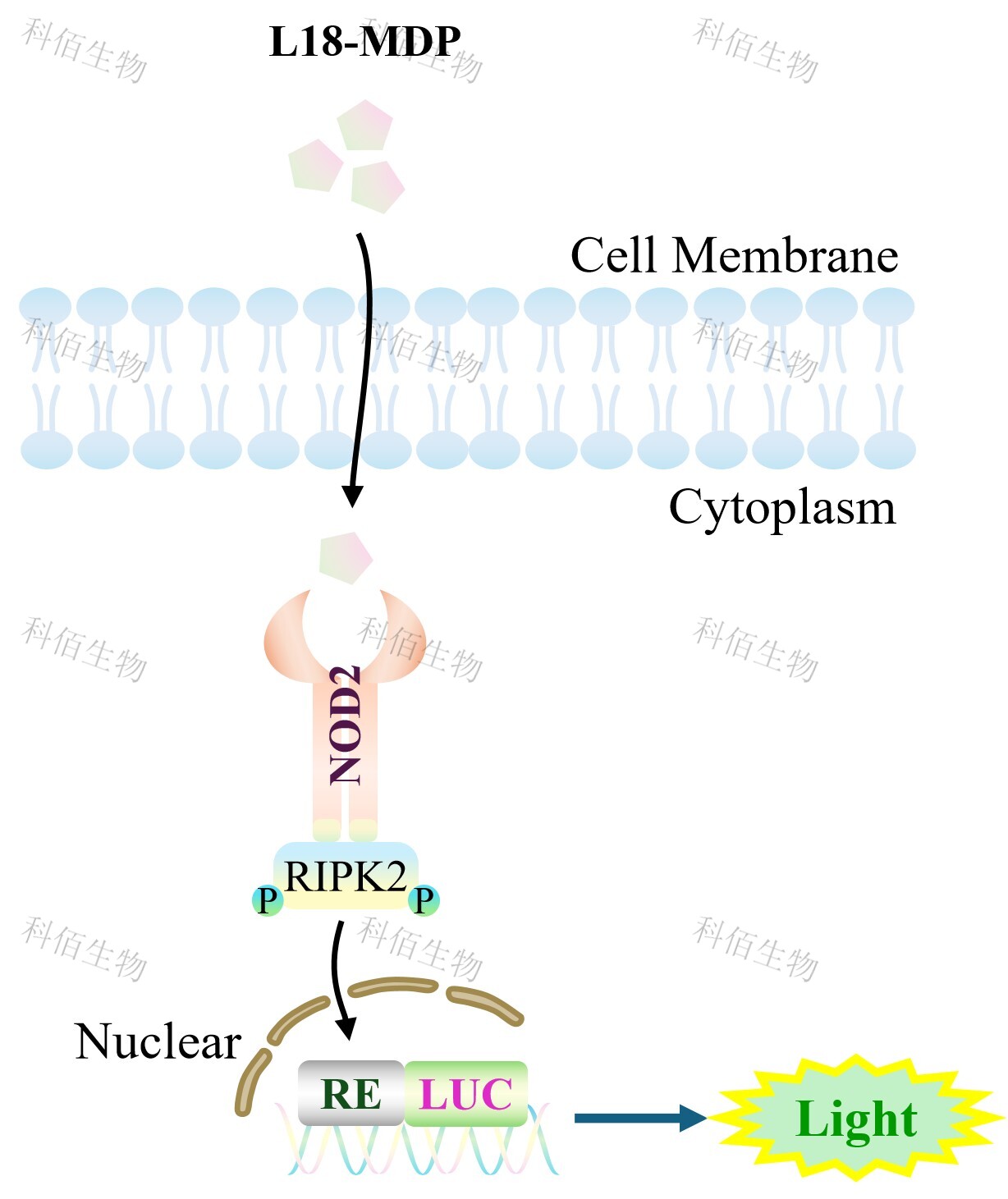 NOD2 Effector Reporter Cell 報(bào)告基因藥靶模型很好的模擬了體內(nèi) NOD2 的信號(hào)轉(zhuǎn)導(dǎo)過程,原理見下圖所示。![]() Figure 1. NOD2 Effector Reporter Cell 細(xì)胞模型原理圖 |