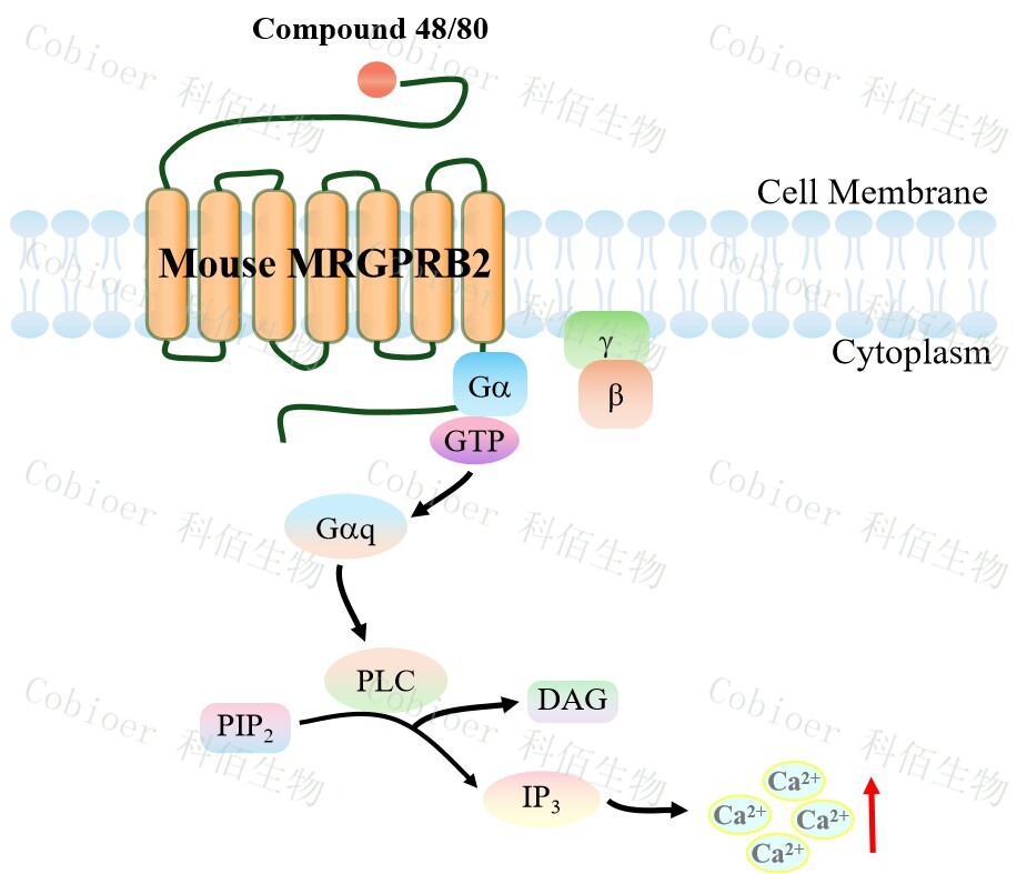 Mouse MRGPRB2 Gα15 HEK293 細(xì)胞,在 Gα15 HEK293 細(xì)胞上,穩(wěn)定表達(dá)鼠的 MRGPRB2。Mouse MRGPRB2 Gα15 HEK293 細(xì)胞藥靶模型很好的模擬了體內(nèi) MRGPRB2&Gα15 的信號轉(zhuǎn)導(dǎo)過程,原理見下圖所示。
