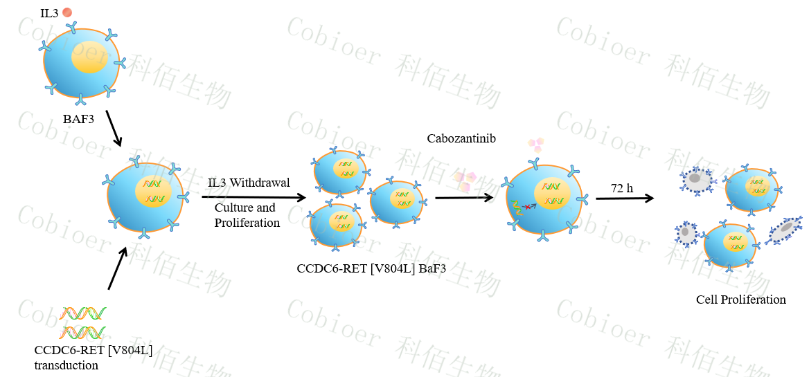 BaF3(小鼠原 B 細胞)的生長和增殖需要 IL-3 的維持。通過引入各種表達激酶的基因, 能作為 BaF3 的驅(qū)動基因,讓 BaF3 不再依賴 IL-3 而增殖,進而激酶基因成為 BaF3 增殖依 賴的驅(qū)動基因,用于評估小分子藥物對激酶的靶向抑制作用,原理及流程見下圖所示。