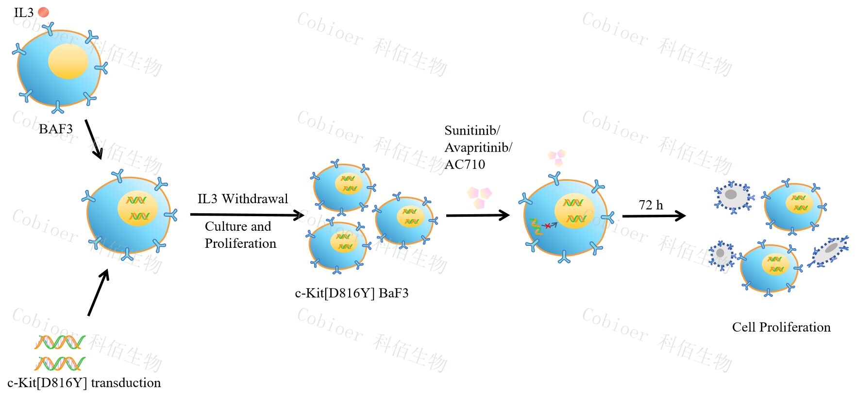 BaF3(小鼠原 B 細(xì)胞)的生長和增殖需要 IL-3 的維持。通過引入各種表達(dá)激酶的基因,能作為 BaF3 的驅(qū)動(dòng)基因,讓 BaF3 不再依賴 IL-3 而增殖,進(jìn)而激酶基因成為 BaF3 增殖依賴的驅(qū)動(dòng)基因,用于評(píng)估小分子藥物對(duì)激酶的靶向抑制作用,原理及流程見下圖所示。 ![]() Figure 1. c-Kit[D816Y] BaF3 細(xì)胞的構(gòu)建原理圖 |