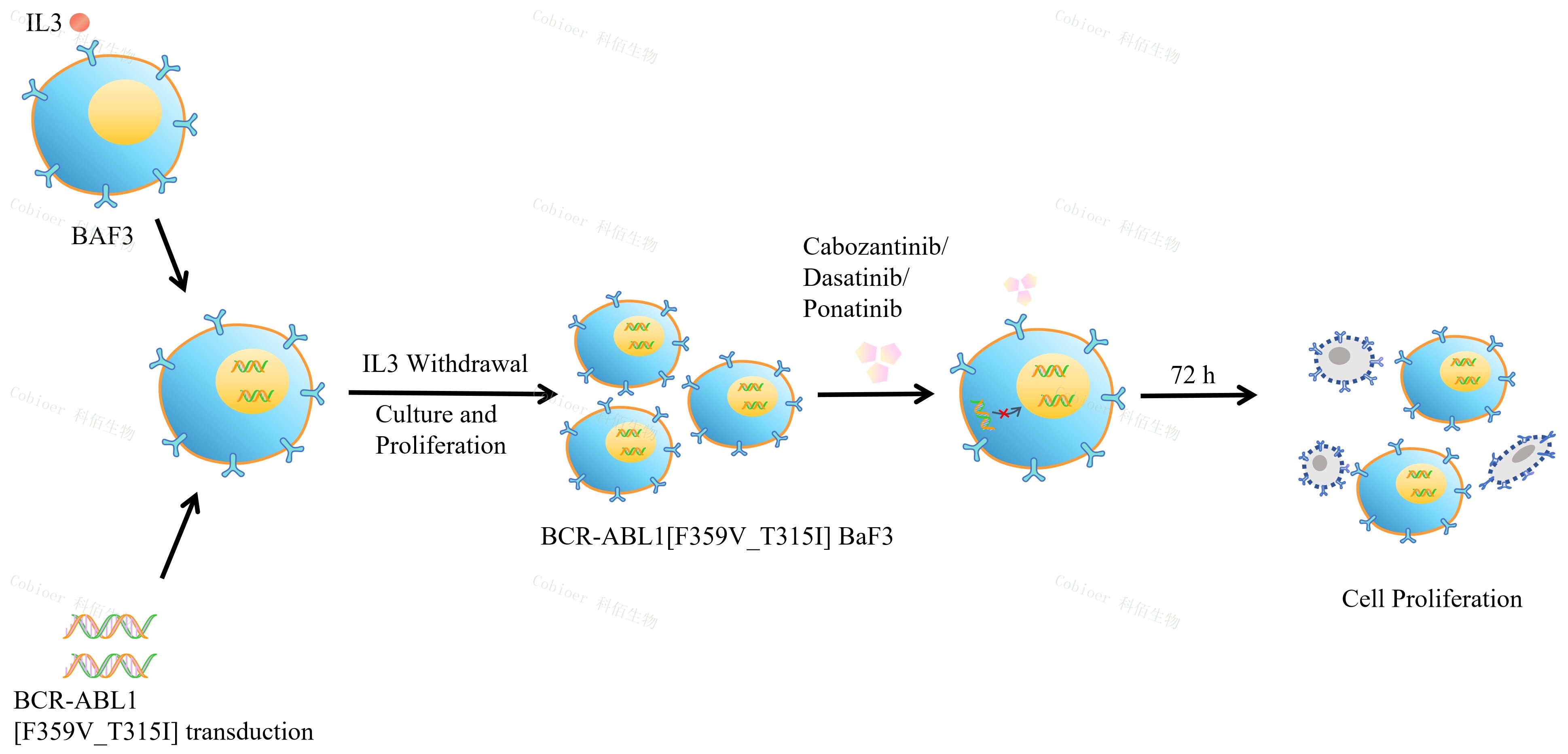 | BCR-ABL1[F359V_T315I] BaF3 藥靶細胞,通過轉(zhuǎn)導(dǎo)突變狀態(tài)的 BCR- ABL1[F359V_T315I] 基因到 BaF3 細胞系中 , 穩(wěn)定表達人突變形態(tài)下的 BCR- ABL1[F359V_T315I]基因。 BaF3(小鼠原 B 細胞)的生長和增殖需要 IL-3 的維持。通過引入各種表達激酶的基因, 能作為 BaF3 的驅(qū)動基因,讓 BaF3 不再依賴 IL-3 而增殖,進而激酶基因成為 BaF3 增殖依賴的驅(qū)動基因,用于評估小分子藥物對激酶的靶向抑制作用,原理及流程見下圖所示。 ![]() Figure 1. BCR-ABL1[F359V_T315I] BaF3 細胞的構(gòu)建原理圖 |