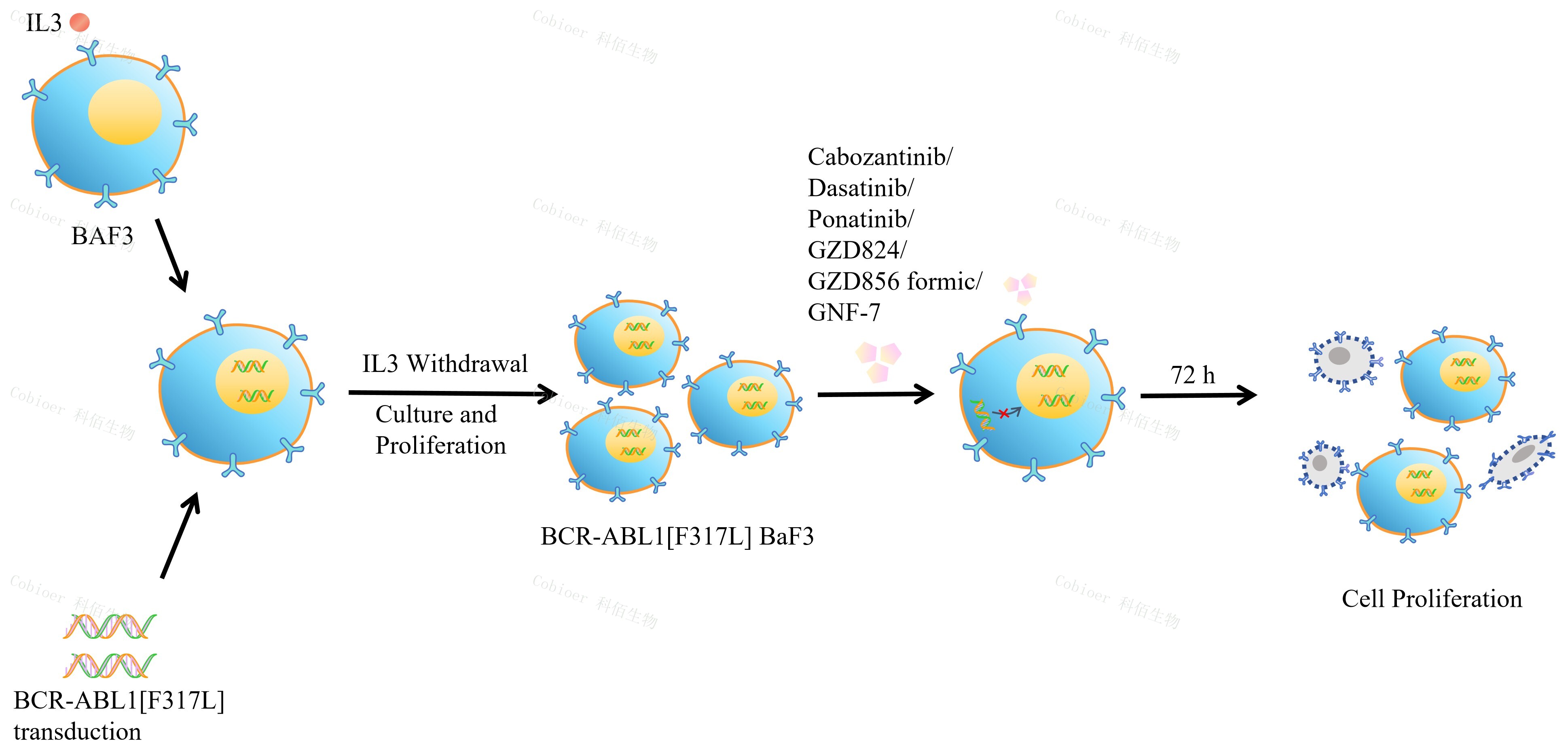 | BCR-ABL1[F317L] BaF3 藥靶細胞 , 通過轉(zhuǎn)導(dǎo)突變狀態(tài)的 BCR- ABL1[F317L]基因到 BaF3 細胞系中,穩(wěn)定表達人突變形態(tài)下的 BCR-ABL1[F317L]基因。 BaF3(小鼠原 B 細胞)的生長和增殖需要 IL-3 的維持。通過引入各種表達激酶的基因, 能作為 BaF3 的驅(qū)動基因,讓 BaF3 不再依賴 IL-3 而增殖,進而激酶基因成為 BaF3 增殖依賴的驅(qū)動基因,用于評估小分子藥物對激酶的靶向抑制作用,原理及流程見下圖所示。 ![]() Figure 1. BCR-ABL1[F317L] BaF3 細胞的構(gòu)建原理圖 |