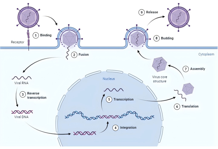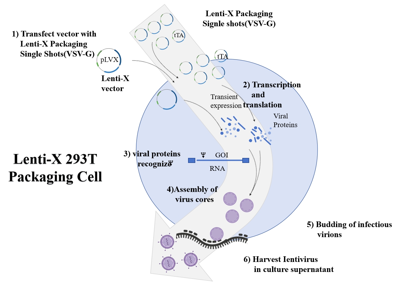慢病毒(LV)是一種有包膜的病毒,最常見的是VSV-G,它通過與特定的細胞表面蛋白(比如LDLR)結合,隨后進行膜融合進入細胞,將含有其遺傳信息的病毒RNA注入細胞質。這種單鏈病毒RNA通過逆轉錄轉化為DNA。病毒DNA進入細胞核,并通過病毒整合酶整合到宿主細胞基因組中。