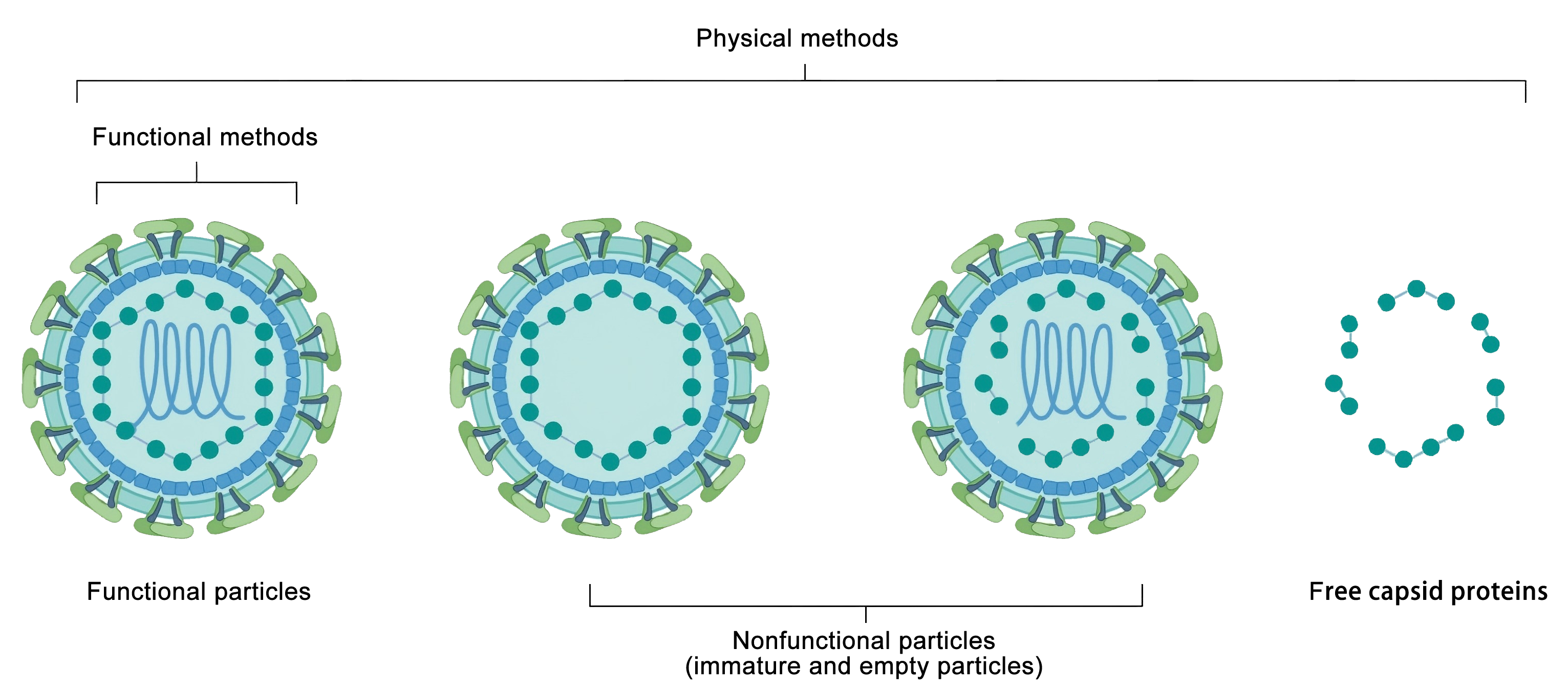圖7 慢病毒包裝上清液中存在的產物。物理方法可以測量上清液中釋放的功能性和非功能性顆粒,以及游離衣殼蛋白(例如 p24)。功能性滴定方法專門測量功能性病毒顆粒。